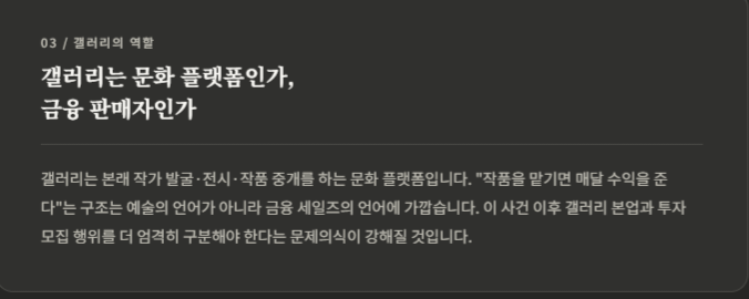 갤러리는 본래 작가를 발굴하고 전시를 만들고 작품 거래를 중개하는 문화 플랫폼에 가까운데, 이번 사건은 갤러리가 수익 상품 판매자처럼 움직일 때 어떤 위험이 생기는지를 보여줬습니다. 특히 “작품을 사서 맡기면 매달 수익을 준다”는 구조는 예술 감상과 컬렉팅의 언어가 아니라 금융 세일즈의 언어에 가깝습니다. 그래서 이 사건 이후 미술계에는 갤러리의 본업과 투자 모집 행위를 더 엄격히 구분해야 한다는 문제의식이 커질 가능성이 높습니다. 이 평가는 수사기관이 공소사실에서 본 사건을 사기 및 유사수신 혐의로 본 점에 기반한 해석입니다.