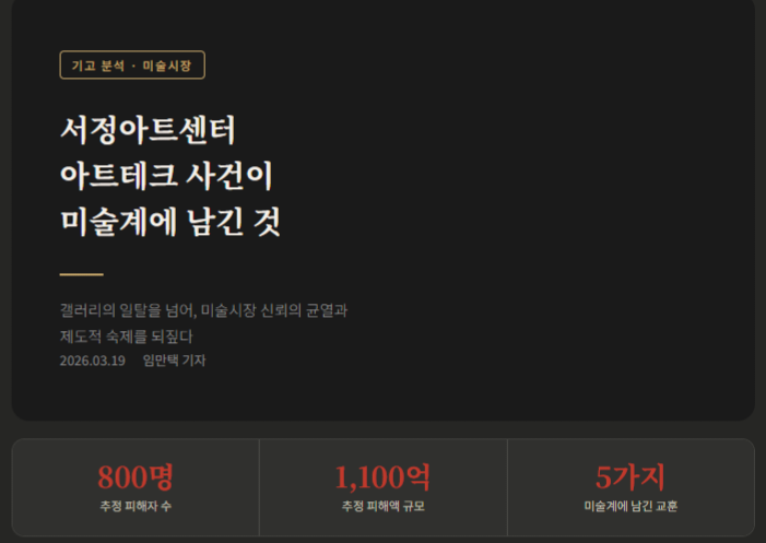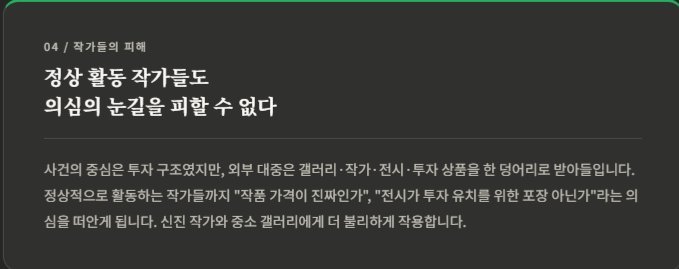 사건의 중심은 투자 구조였지만, 외부 대중은 종종 갤러리와 작가, 전시와 투자 상품을 한 덩어리로 받아들입니다. 그 결과 정상적으로 활동하는 작가들까지 “작품 가격이 진짜인가”, “전시가 투자 유치를 위한 포장 아닌가”라는 의심을 함께 떠안게 됩니다. 이는 신진 작가나 중소 갤러리에게 더 불리하게 작용할 수 있습니다. 이 부분은 제도 발표보다 사건이 미술시장 신뢰에 미친 파급을 해석한 것입니다. 다만 피해 규모와 사건 성격이 컸다는 점이 이런 해석을 뒷받침합니다.