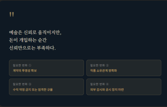 이 사건이 미술계에 남긴 것은 단순한 “한 갤러리의 일탈”이 아니라, 미술시장에 대한 신뢰의 균열입니다.