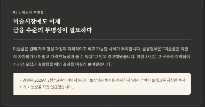 예술은 신뢰로 움직이지만, 돈이 개입하는 순간 신뢰만으로는 부족하다는 것입니다. 앞으로 미술계가 회복해야 할 것은 단순한 이미지가 아니라, 계약의 투명성, 작품 소유관계의 명확화, 수익 약정 금지 또는 엄격한 규율, 외부 감시와 공시 같은 최소한의 제도적 장치입니다. 금감원도 2026년 3월 다시 “고수익이면서 원금이 보장되는 투자는 존재하지 않는다”며 유사수신 경보를 냈고, 아트테크를 사칭한 투자사기 가능성을 직접 언급했습니다.
