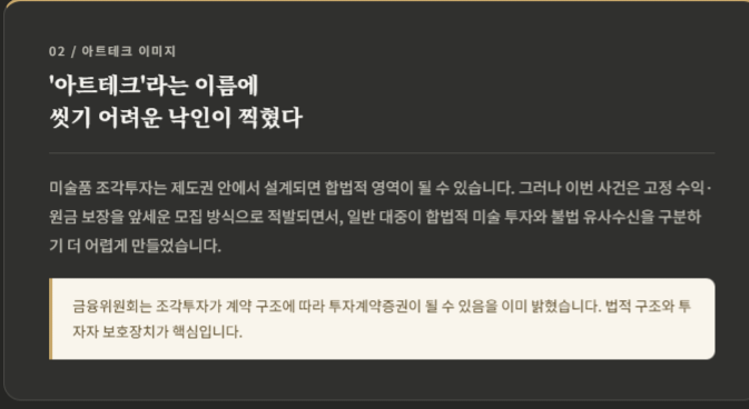 미술품은 원래 가격 형성 과정이 폐쇄적이고, 비교 가능한 시세가 부족하며, 이해관계자 설명에 크게 의존하는 경우가 많습니다. 금융당국이 조각투자 관련 소비자경보에서 미술품 등은 객관적 가치평가가 쉽지 않고 거래량도 많지 않아 가격 변동성이 클 수 있다고 지적한 이유도 여기에 있습니다. 이번 사건은 그 구조적 취약점이 사기성 모집과 결합하면 얼마나 큰 피해로 이어질 수 있는지 보여준 사례로 남았습니다.