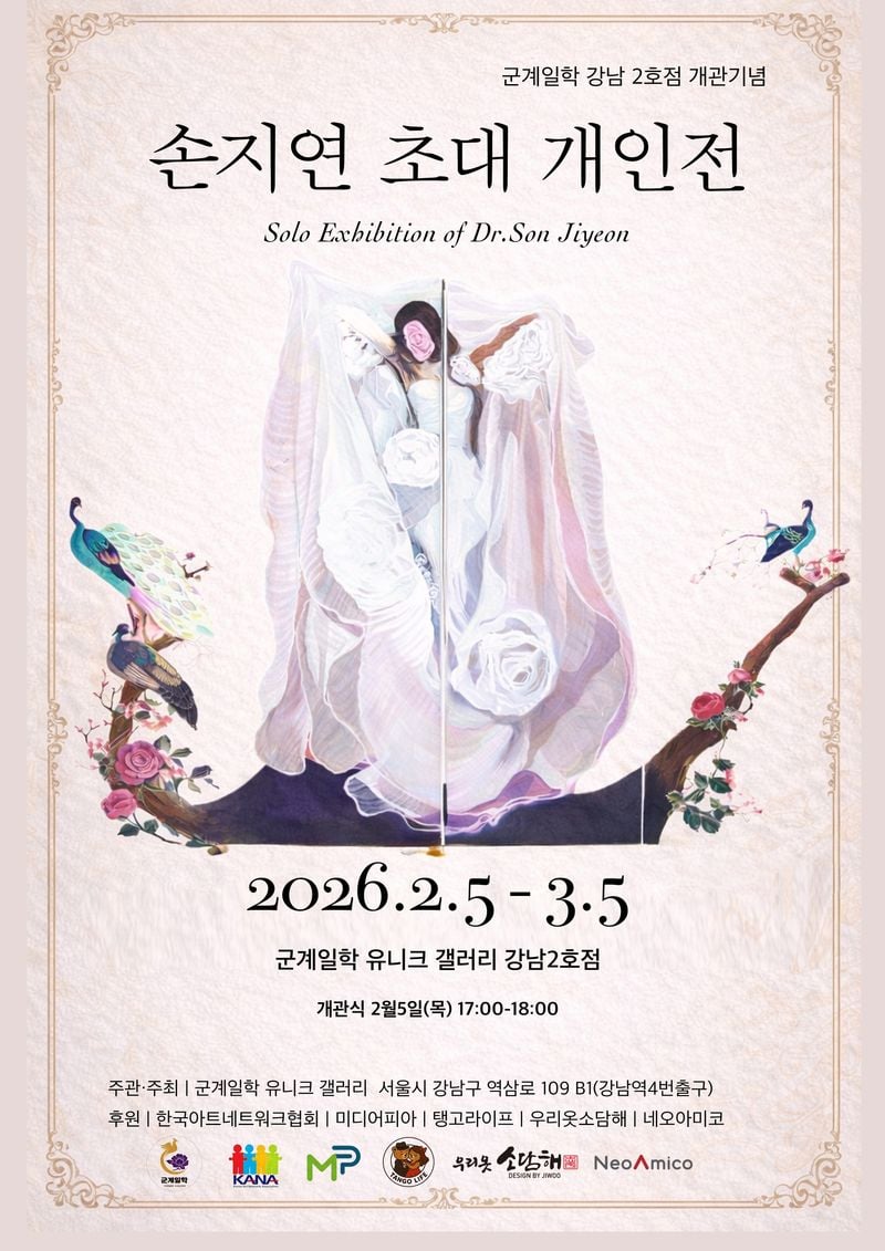 군계일학 유니크(UNIQUE) 갤러리 강남(2호점)이 개관을 기념해 손지연(Son Ji Yeon) 미술학 박사 초대 개인전을 개최한다. 전시는 2026년 2월 5일(목)부터 3월 5일(목)까지 열리며, 개관식은 2월 5일(목) 오후 5시~6시 진행된다. 전시는 군계일학 유니크 갤러리가 주관·주최하고 한국아트네트워크협회, 미디어피아, 탱고라이프, 우리옷소담해, 네오아미코가 후원한다.