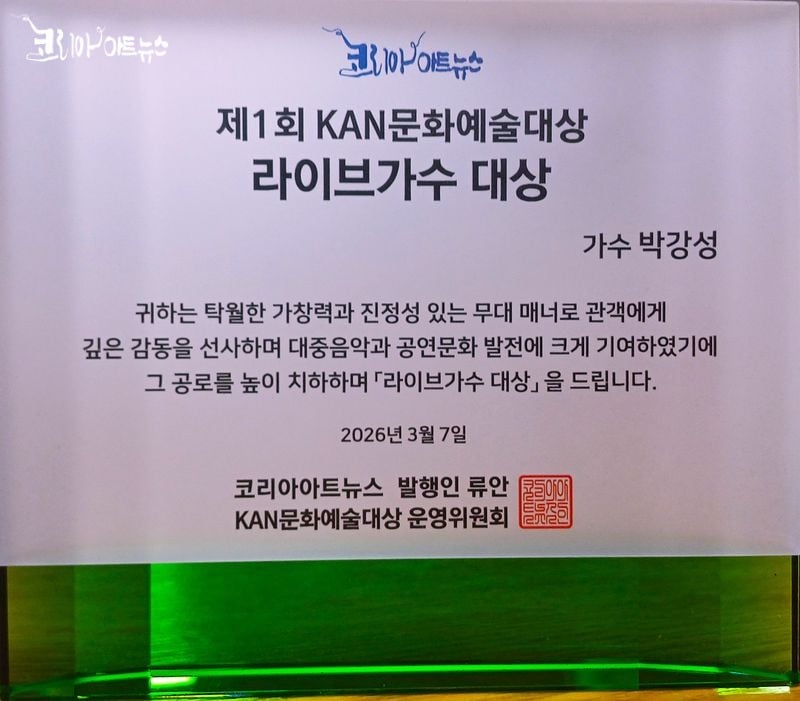 가수 박강성이 3월 7일 서울 송파여성문화회관에서 열린 제1회 KAN문화예술대상 시상식에서 라이브가수 대상을 수상하며 오랜 음악 활동의 진정성과 열정을 인정받았다.