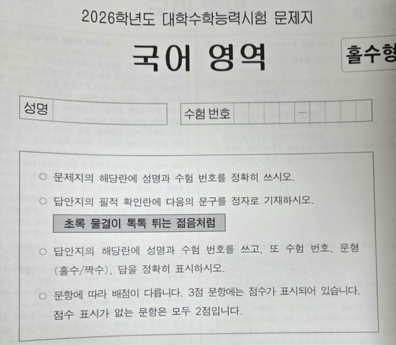 13일 시행된 2026년 대학수학능력시험(수능)의 수험생 필적 확인 문구는 "초록 물결이 톡톡 튀는 젊음처럼" 이다.