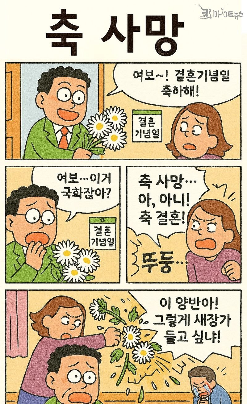 평소에 눈치가 없어도 보통 없는 것이 아닌 남편이 결혼기념일이라고 사 온 꽃이 국화다. 흔히 장례식장에 들어가는 꽃이 국화이기에 무심히 뱉은 말이 “여보! 축 결혼!”이 아니었다. 말이 헛나왔다. “축 사망.” 아내는 화가 나 그 국화꽃을 벽에다 냅다 때려 산산이 흩어지게 했다. 이 양반아! 그렇게 새장가 들고 싶냐! 상상력의 산물이라고 해도 얼마나 유머러스한 장면인가. 그 집의 남정네는 열흘은 싹싹 빌었겠다.