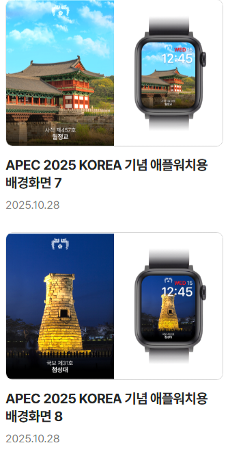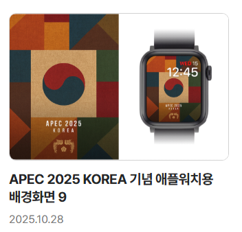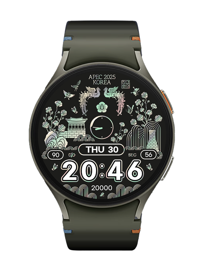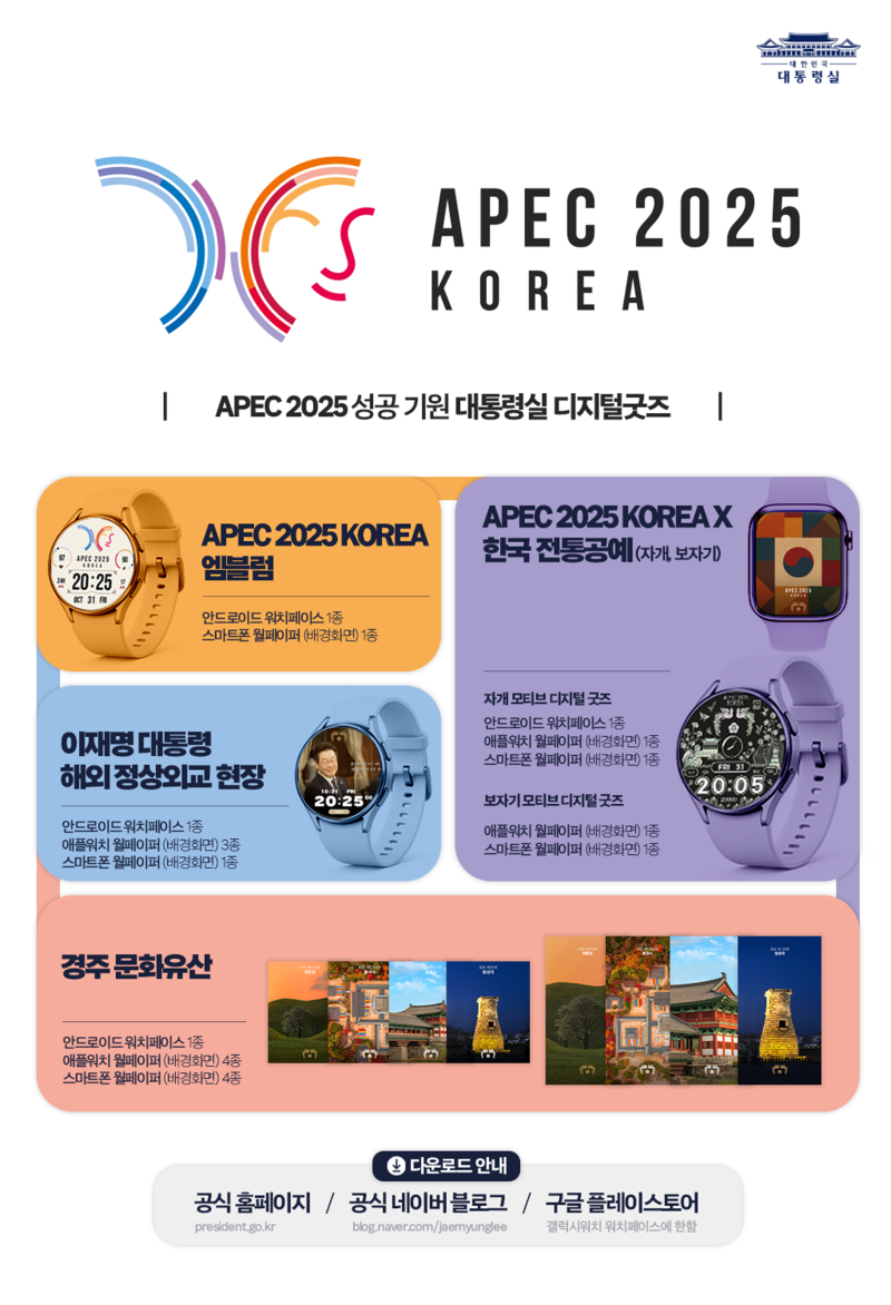 공식 APEC 2025 엡블럼과 이재명 대통령의 해외 정상외교 현장 사진, 그리고 경주 문화유산과 전통공예가 담긴 '디지털 굿즈' 를 스마트워치 안드로이드용과 애플워치용으로 발표했다.