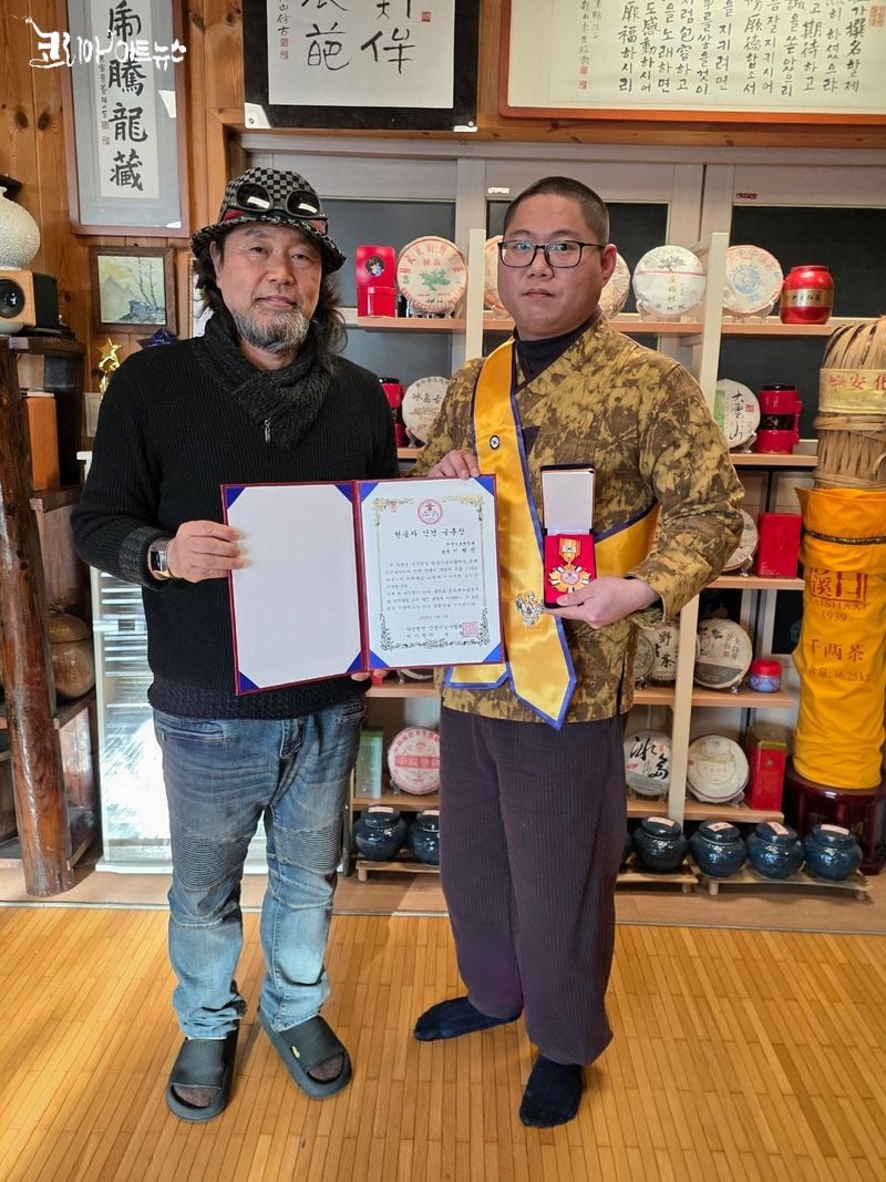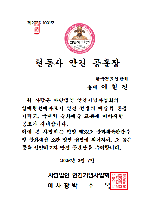 [문화=코리아아트뉴스 이청강 기자] 지난 2월 7일 충청남도 서산시에 위치한 해인미술관에서 한국검도연합회 이현진 총재가 안견기념사업회 이사장 박수복(LUCAS Park) 화백으로 부터 현동자 안견 공훈장을 수상했다.