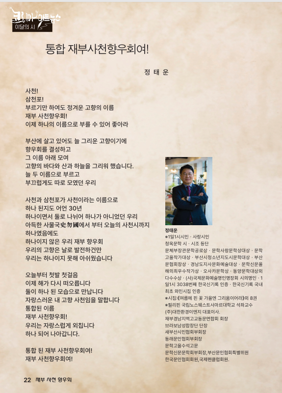이날 행사에 "1일 1시 쓰는 시인" (주)대한환경이엔지 대표이사 남천 정태운 시인이 참석했으며, <통합 재부사천향우회여!> 축하 시를 황정희 낭송가가 본 행사에서 낭송했다.