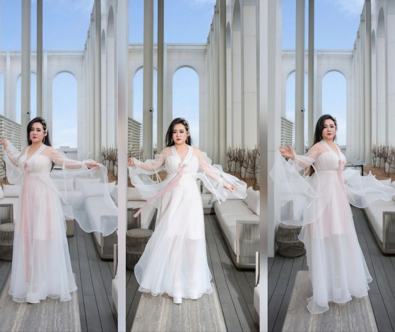 양지우 한복 디자이너(우리옷 소담해 대표)가 디자인한 한복 쉬폰 드레스는 전통 한복의 단아한 절제미와 현대 서양 드레스의 낭만적인 화려함을 결합한 '포스트모더니즘 한복'의 정수를 보여준다. 전통과 현대 의상의 가장 큰 특징은 쉬폰 소재의 투명성과 레이어링으로, 전통적인 비단(실크) 대신 현대적인 쉬폰(Chiffon) 소재를 사용했다. 쉬폰 특유의 가볍고 하늘하늘한 성질 덕분에 걸을 때마다 자락이 섬세하게 흩날리며 환상적인 분위기를 연출했다.