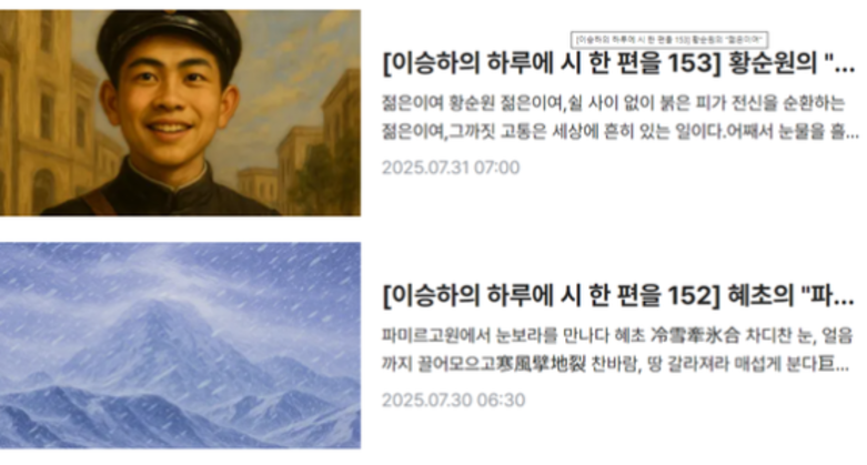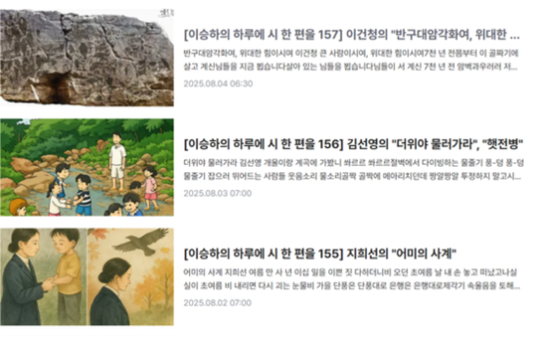 2025년 3월 1일 첫 연재를 시작한 이승하 시인은 지난 1년 동안 하루도 빠짐없이 시를 소개하고 해설을 남겼다. 주중에는 현대시를 중심으로 매일 한 편의 시를 해설했고, 토요일에는 시조, 일요일에는 동시를 다루며 장르의 폭을 넓혔다.
