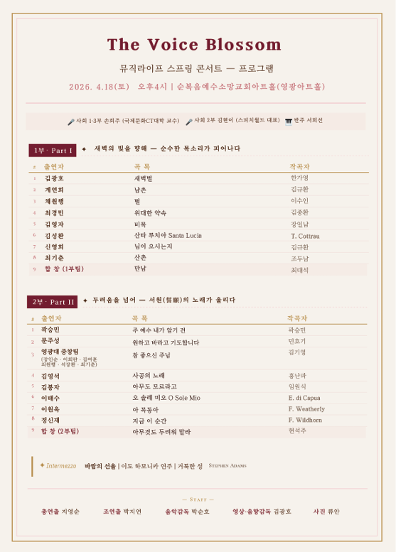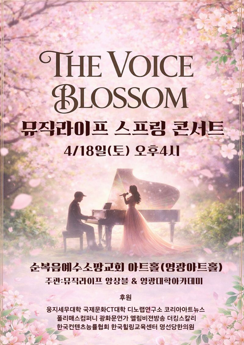 뮤직라이프 앙상블과 영광대학아카데미가 주관하는 The Voice Blossom 뮤직라이프 스프링 콘서트가 는 오는 4월 18일 오후 4시, 서울 순복음예수소망교회 아트홀에서 열린다. 이번 공연은 봄의 시작을 알리는 따뜻한 무대 위에서, 각기 다른 삶의 이야기를 담은 목소리들이 하나의 꽃처럼 피어나는 시간을 선사한다.