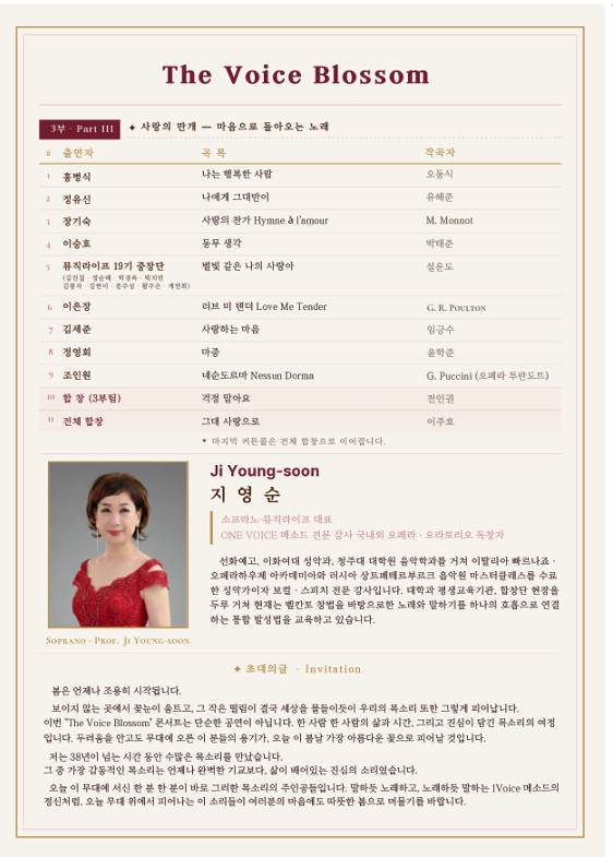 이번 The Voice Blossom 콘서트는 단순한 음악회가 아니라, 각자의 삶과 진심이 담긴 목소리가 모여 하나의 꽃을 피운 무대가 될 것으로 기대된다.