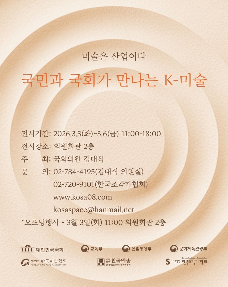 서울국제조각페스타 2026의 성과가 국회 전시로 이어진다. 한국조각가협회는 2026년 3월 3일부터 6일까지 국회의원회관 2층에서 「미술은 산업이다 – 국민과 국회가 만나는 K-미술」 전시를 개최한다고 밝혔다. 이번 전시는 서울국제조각페스타 성료 이후 성과와 담론을 ‘정책의 공간’으로 확장하는 첫 공식 행보로, 우원식 국회의장이 직접 참석해 축사를 전할 예정이어서 관심이 모인다.