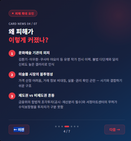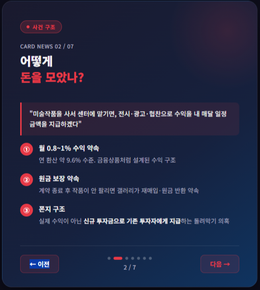 언론 보도에는 김환기, 이우환, 쿠사마 야요이 등 유명 작가 작품을 전시해 업계 인지도를 쌓았다고 나옵니다. 즉, 전형적인 불법 다단계 업체와 달리 문화예술 기관의 외피가 강했다는 점이 투자자 판단을 흐렸습니다.