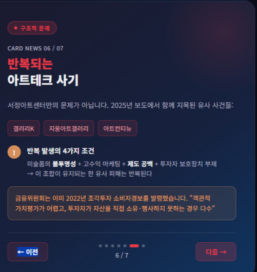 2025년 보도들은 갤러리K, 지웅아트갤러리, 아트컨티뉴 등 다른 아트테크·미술품 투자 사기 의혹 사건들과 함께, 미술시장과 금융시장의 경계에서 반복적으로 발생하는 구조적 문제를 지적했습니다. 즉, 미술품이란 자산의 불투명성, 고수익 마케팅, 제도 공백, 투자자 보호장치 부재가 결합하면 비슷한 피해가 반복될 수 있다는 것입니다.