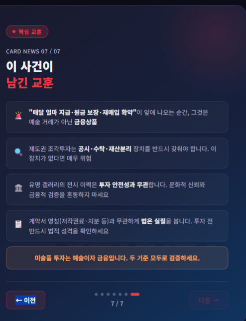 미술품 자체가 아니라 “매달 얼마 지급”, “원금 보장”, “재매입 확약”이 앞에 나오는 순간 그것은 예술 거래가 아니라 금융상품에 가깝고, 제도권 공시·수탁·재산분리 장치가 없다면 매우 위험하다는 점입니다.