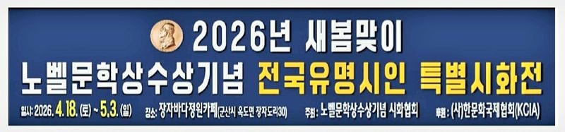 [문학=코리아아트뉴스 이청강 기자] 노벨문학상수상기념 시화협회(회장 추원호)가 주최하는 "2026년 새봄맞이 노벨문학상수상기념 전국유명시인 특별시화전"이 군산시 옥도면 소재 장자바다정원카페에서 오는 4월 18일부터 5월 3일까지 개최된다.