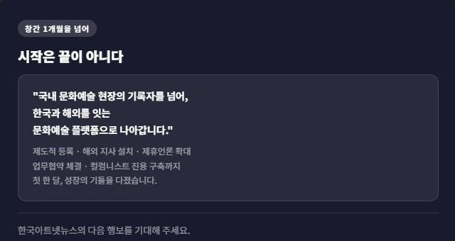 창간 1개월은 끝이 아니라 시작이다. 한국아트넷뉴스는 첫 한 달 동안 제도적 등록, 해외 지사 설치, 제휴언론 확대, 업무협약 체결, 컬럼니스트 진용 구축까지 압축적으로 전개하며 성장의 기틀을 다졌다. 국내 문화예술 현장의 기록자를 넘어, 한국과 해외를 잇는 문화예술 플랫폼으로 나아가고 있는 한국아트넷뉴스의 다음 행보가 주목된다.