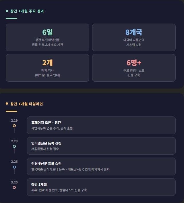 한국아트넷뉴스는 창간 당일 홈페이지를 완료하고 사업자등록 업종을 추가했으며, 2월 23일 서울특별시에 인터넷신문 등록을 신청해 2월 25일 승인을 받았다. 같은 날 한국예술문화단체총연합회 공식파트너 인터넷신문 등록도 이뤄지면서 매체의 제도적 기반과 대외 신뢰도 역시 빠르게 갖춰졌다.