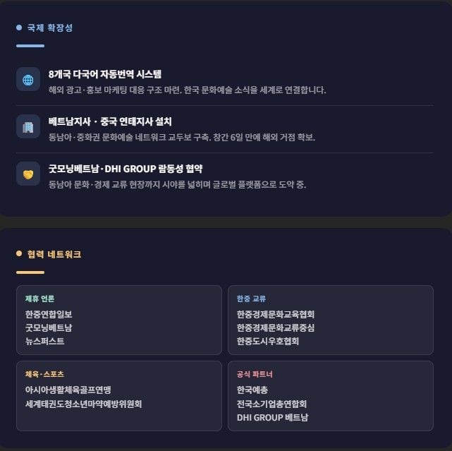 특히 굿모닝베트남과의 협약, DHI GROUP 베트남 람동성 행사 공식언론사 업무협약은 한국아트넷뉴스가 동남아 문화·경제 교류의 현장까지 시야를 넓히고 있음을 상징적으로 보여준다.