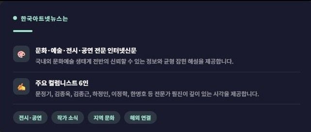 한국아트넷뉴스는 스스로를 대한민국의 문화·예술·전시·공연·지역 문화 현장 소식을 다루는 인터넷신문 매체로 소개하고 있다. 예술계의 다양한 행사와 작품, 작가 소식을 전달하고, 문화예술 생태계 전반에 대한 신뢰할 수 있는 정보와 균형 잡힌 해설을 제공하는 플랫폼이라는 점에서 일반 뉴스 매체와는 차별화된 정체성을 지닌다. 문정기, 김종욱, 김종근, 하정민, 이정학, 한명호 등 주요 컬럼니스트가 참여하고 있는 점도 이러한 방향성을 뒷받침한다.