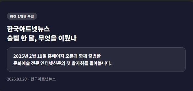 한국아트넷뉴스가 3월 20일 창간 1개월을 맞았다. 지난 2월 19일 홈페이지 오픈과 함께 출범한 한국아트넷뉴스는 한 달이라는 짧은 시간 동안 인터넷신문 등록을 완료하고, 국내외 문화예술 네트워크를 빠르게 넓히며 문화예술 전문 인터넷신문으로서 존재감을 키워가고 있다.