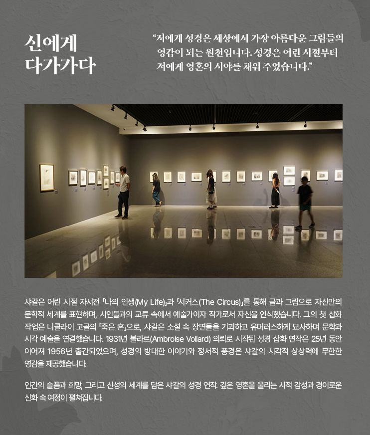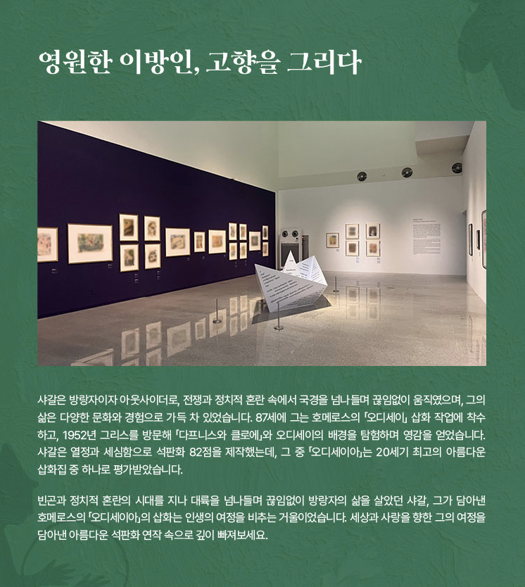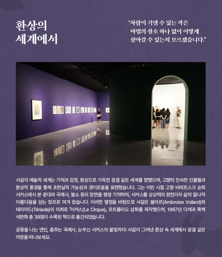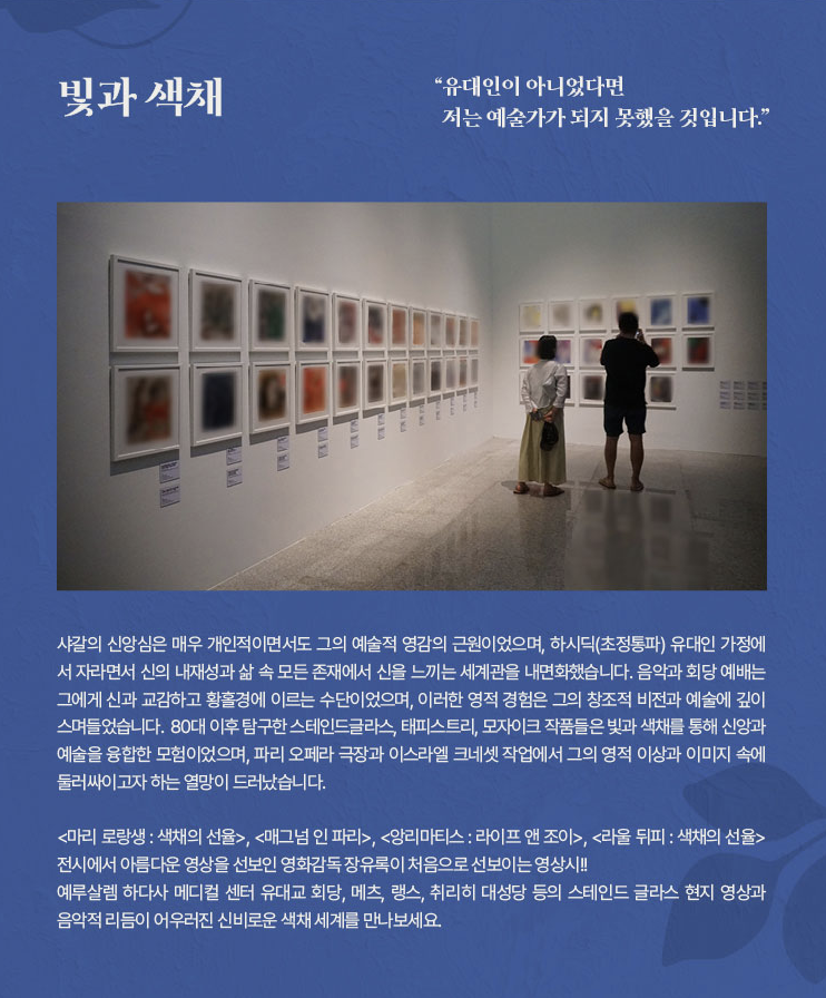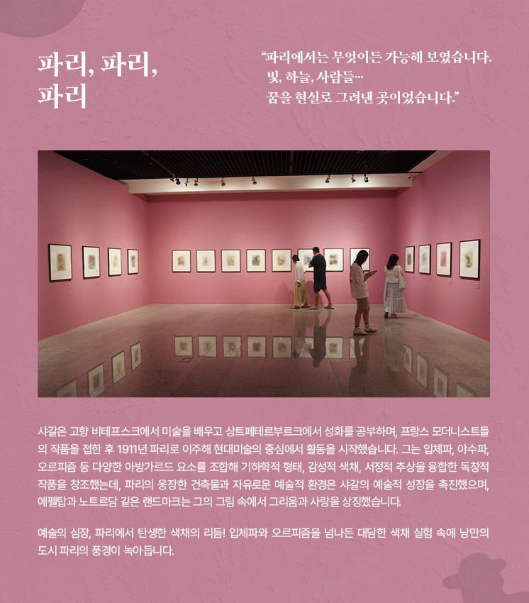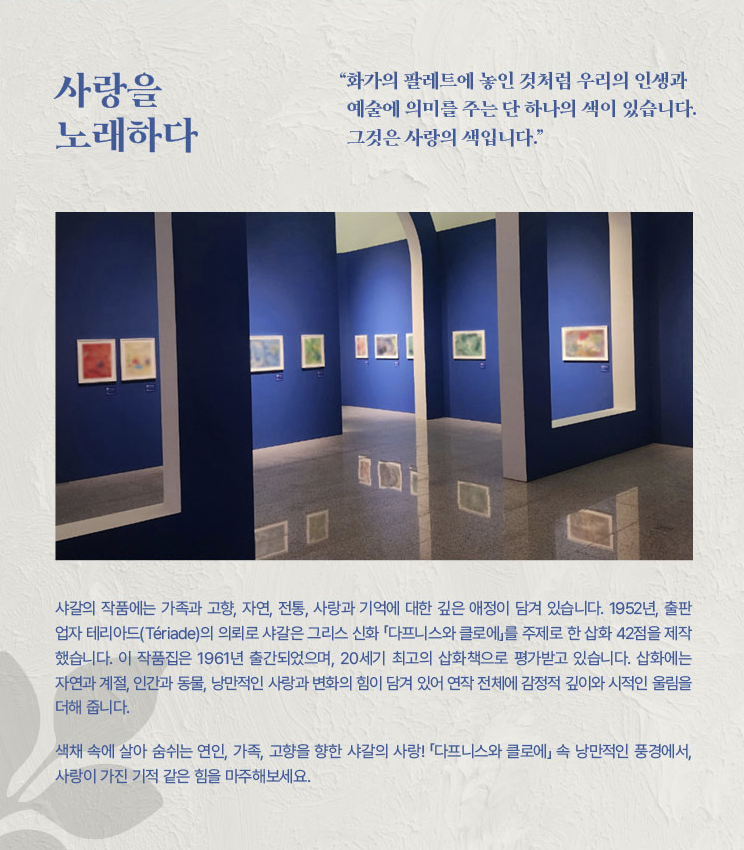전시는 연대기적 구성에서 탈피해 △사랑을 노래하다 △환상의 세계에서 △신에게 다가가다 △파리, 파리, 파리 △빛과 색채 △영원한 이방인 의 6개 섹션으로 구성됐다.