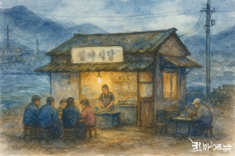그의 항해가 끝나는 시간, 바닷가에 배를 대는 그를 위해 열어둔 집. 어김없이 찾아오는 손님을 위한 연중무휴 밥집이다. 파도에 많이 부대낀 날에는 깃을 접지 못한 갈매기들이 날개를 퍼덕이며 함께 날아와 떼창을 하기도 한다. 모두 휴식이 필요한 시간일 때, 그는 새벽이면 다시 바다로 나가는 성실함을 잃지 않아야 하고, 거친 파도와 싸우며 항해를 계속해야 한다. 그러니 심야식당은 문을 닫을 수가 없다. 갈매기들이 떼로 몰려온 날은 통조림 캔을 따서 얼큰하게 그들의 입맛을 돋우고 한 잔의 소주로 회한을 풀게 한다. 그러고는 잔칫집처럼 국수를 삶아 벌겋게 버무린 매콤달콤한 국수 한 그릇을 안긴다.