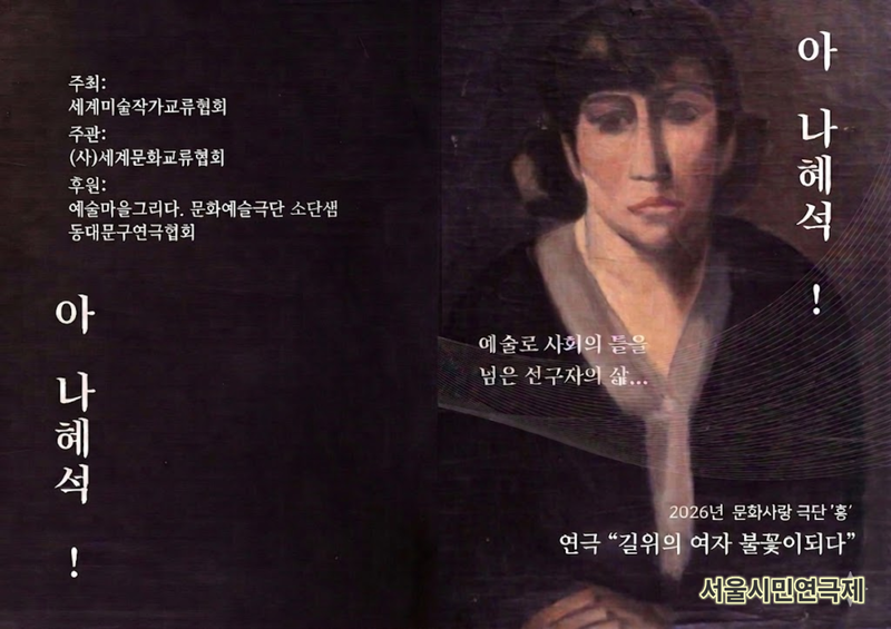 한편, 문화사랑 극단 ‘흥’의 ‘아~! 나혜석, 길위의 여자 불꽃이 되다’는 2026년 제12회 서울시민연극제 선정작으로 공식 발표됐으며, 세계미술작가교류협회가 함께하는 예술 연대의 의미를 더해 더욱 관심을 모으고 있다. 이번 공연은 예술을 통해 시대를 다시 읽고, 잊힌 불꽃을 현재의 언어로 되살리는 뜻깊은 무대가 될 것으로 기대된다.