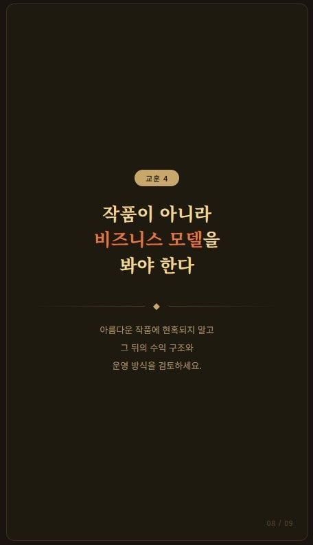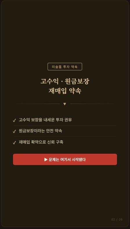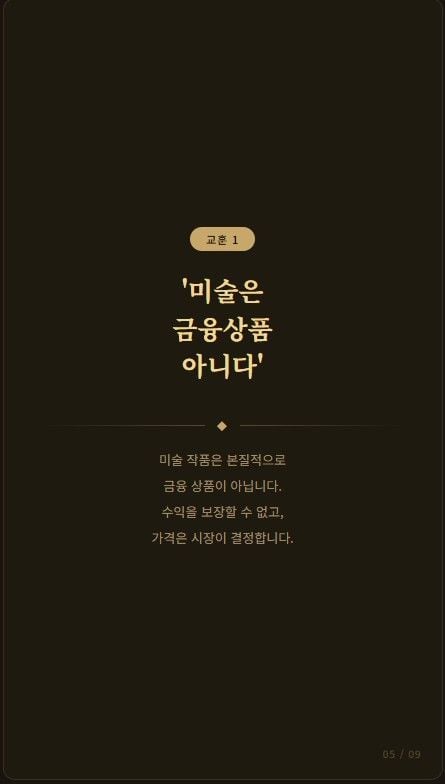 미술품은 본질적으로 가격 변동성이 크고, 매수자 찾기가 쉽지 않으며, 단기간 현금화가 어렵습니다. 이런 자산에 대해 확정수익, 정기배당, 원금보장을 약속한다면 그 자체로 먼저 의심해야 합니다. 미술은 투자 대상이 될 수는 있어도, 예금처럼 안정성과 환금성을 보장하는 자산은 아닙니다. 이 사건은 “예술”과 “금융”을 섞을 때 가장 먼저 따져야 할 것이 감성이 아니라 현금흐름의 실재 여부라는 점을 보여줍니다.
