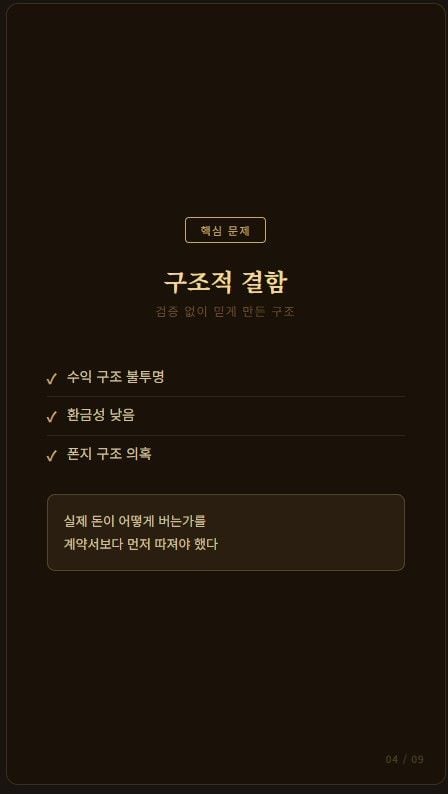 피해자 진술을 보면 계약서, 재매입 약정, 공증 이야기까지 등장합니다. 그러나 문서의 존재와 법적 집행 가능성은 전혀 다른 문제입니다. 상대방이 실제로 그 약속을 이행할 재무능력과 자산을 갖고 있는지, 수익이 어디서 발생하는지가 확인되지 않으면 계약서는 안심 자료일 뿐 안전장치가 아닙니다. 보도에서도 피해자들이 계약상 원금 보장을 믿었지만, 환매 시점에 약속이 지켜지지 않았다고 전했습니다.