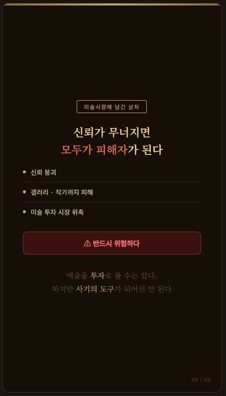 동시에 이 사건은 미술계 내부에도 질문을 던졌습니다. 갤러리는 작품을 소개하고 작가를 키우는 공간인가, 아니면 금융상품 판매 창구가 될 수 있는가. 예술의 공공성과 시장 기능이 섞일 수는 있어도, 투자 권유가 갤러리 본연의 역할을 압도하는 순간 시장은 쉽게 왜곡된다는 사실을 보여준 셈입니다. 이는 미술시장의 제도화와 자율규범 강화가 왜 필요한지 설명해 줍니다.