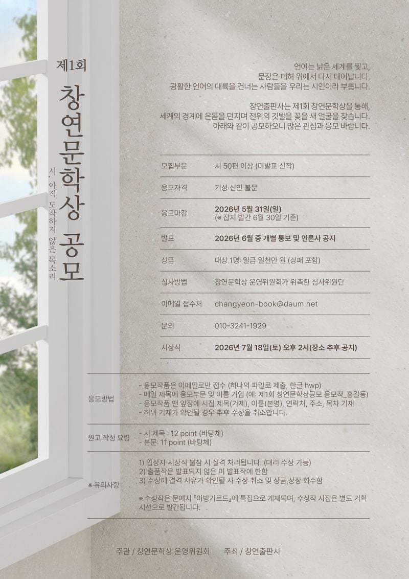 창연출판사가 시의 언어를 새롭게 사유하고 실험하기 위한 『제1회 창연문학상』을 제정했다. 상금 1,000만 원이 수여되는 이번 문학상은 기존의 문학적 틀을 넘어, 아직 도착하지 않은 목소리를 향한 시적 탐색을 본격적으로 시작한다.