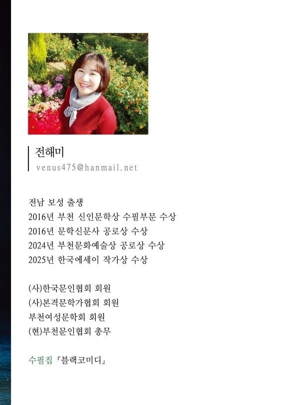 구순 어머니께서는 셋째딸 해미가 책을 낸다고 하니 함박같이 웃으시며 장하다고 대견해하셨습니다. 건강을 유지하셔서 제 책이 닳도록 읽어주시기를 소망합니다. 늘 응원해 주는 가족들과 형제간들, 해미 바라기 친구들에게도 고마운 마음을 전합니다. 문학회 활동을 함께하는 문우님들께도 감사한 마음 전합니다.
