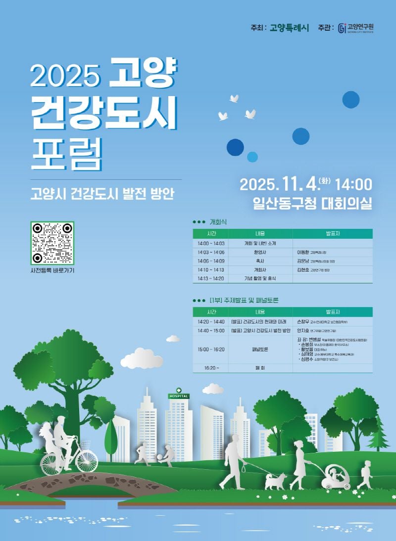 포럼에서는 ‘건강도시의 현재와 미래’라는 주제로 기조 발표가 진행된 후, ‘고양시 건강도시’ 연구 발표 및 각 분야 전문가들의 패널 토론이 이어진다. 이번 연구는 인구 구성 변화, 도시 환경, 시민 생활 특성 등을 바탕으로 고양형 건강도시 정책의 방향과 추진 전략을 담고 있다.