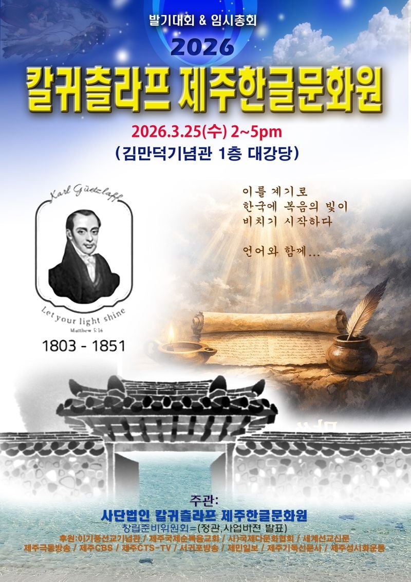 한국 개신교 최초의 선교사 칼 귀츨라프(1803~1851)의 문화선교 정신을 계승하는 귀츨라프제주한글문화원이 오는 3월 25일 제주 제주시 김만덕기념관에서 창립총회를 연다.