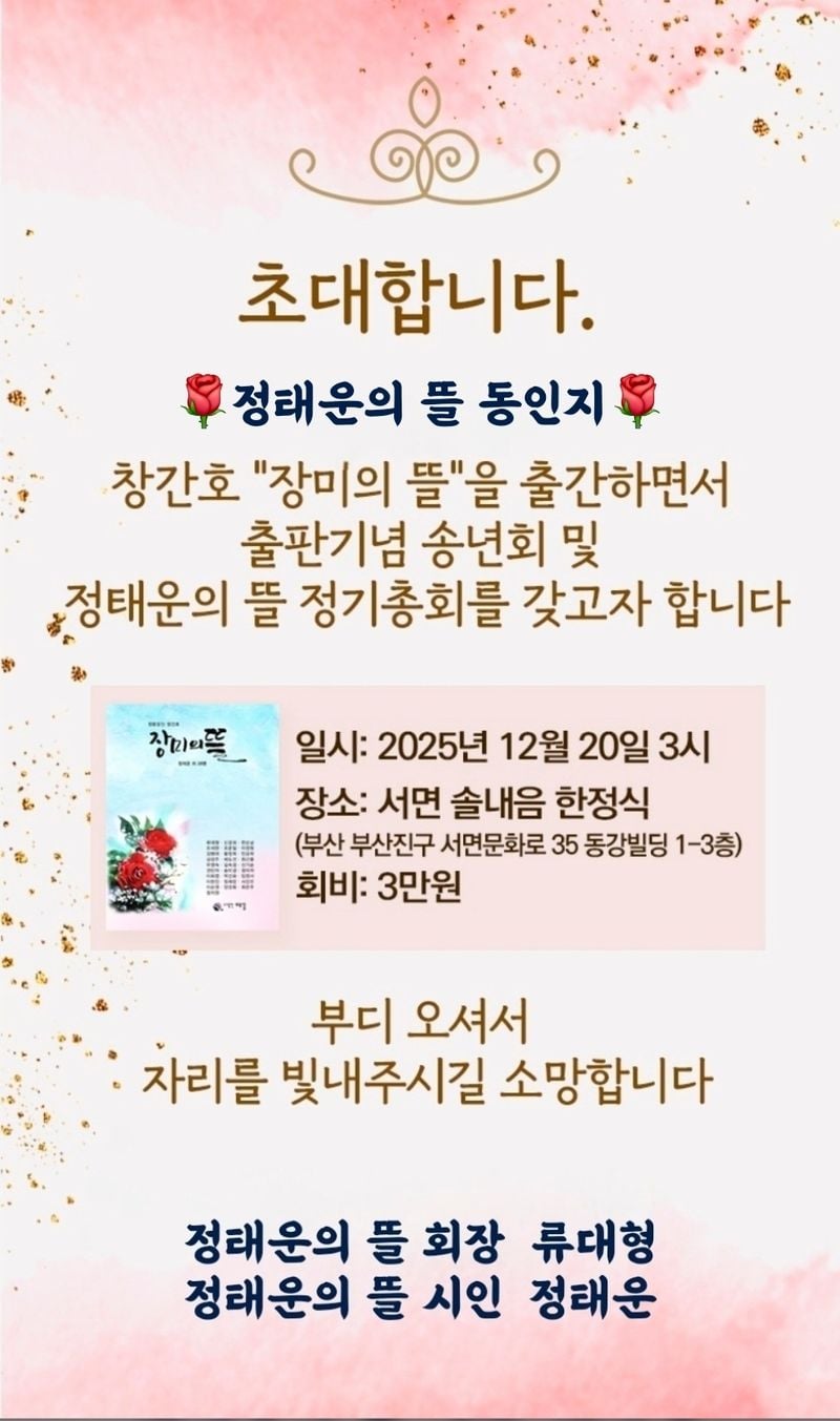 [문학=코리아아트뉴스 이청강 기자] '정태운의 뜰' 회장 류대형은 "오는 12월 20일 오후 3시, 부산 서면 솔내음 한정식에서 정태운의 뜰 창간호 동인지 <장미의 뜰> 출판기념회가 개최한다." 고 밝혔다.