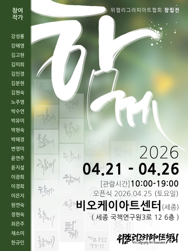 [문화예술=코리아아트뉴스 이청강 기자] 4월 21일 부터 오는 26일까지, 세종 국책연구원3로 12 소재 비오케이아트센터 6층에서 위캘리그라피아트협회 창립전 '함께' 전시회가 개최한다.