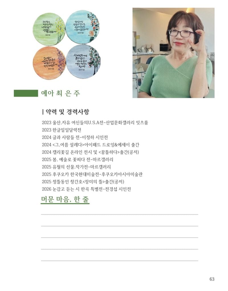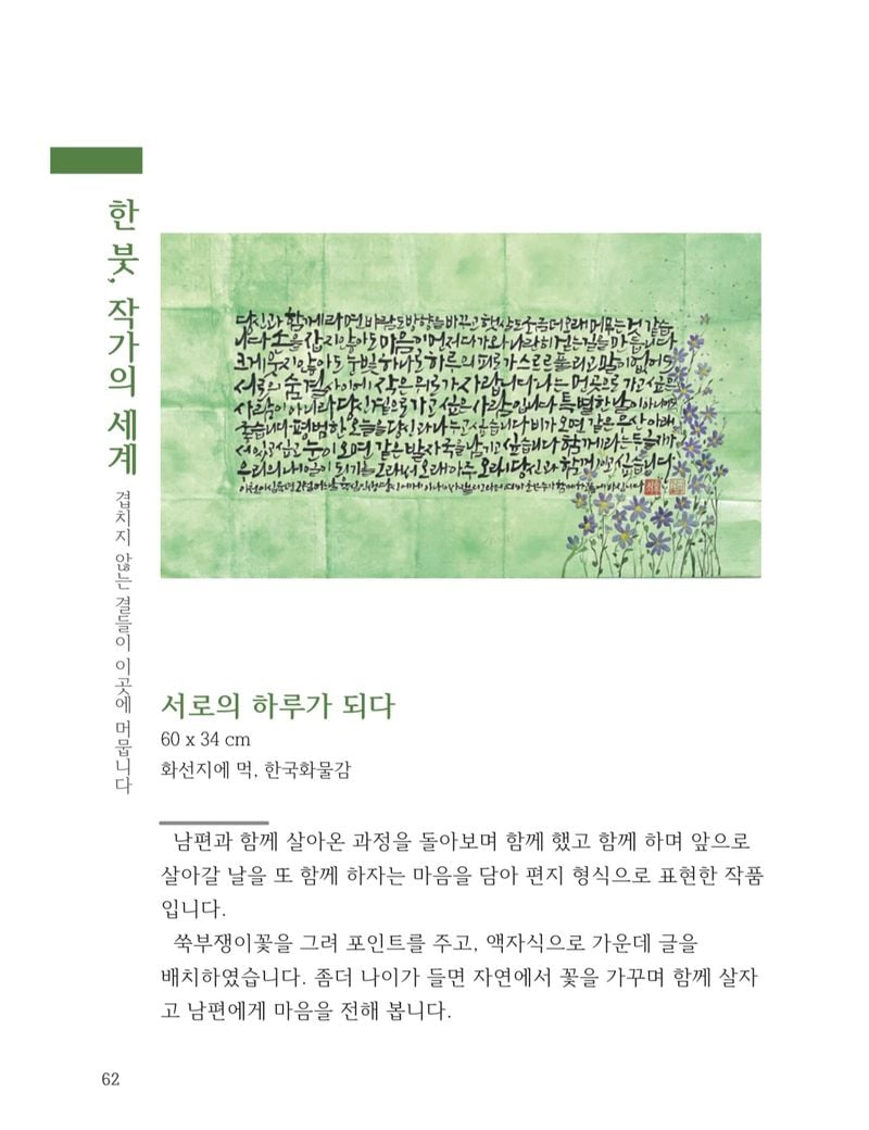 이번 창립전 행사에는 예아 최은주 작가가 <서로의 하루가 되다> 화선지에 먹, 한국화물감 작품을 출품했다. 예아 최은주 작가는 "남편과 함께 살아온 과정을 돌아보며 함께 했고 함께 하며 앞으로 살아갈 날을 또 함께 하자는 마음을 담아 편지 형식으로 표현했다." 며, "쑥부쟁이꽃을 그려 포인트를 주고 액자식으로 가운데 글을 배치했다." 고 작품을 소개했다.
