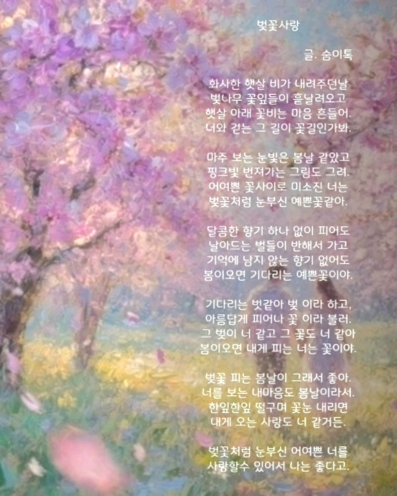 행복한 주말에 벚꽃에 대한 사랑을 노래한 시와 음악을 소개하려 한다. '정태운의 뜰' 회원 숨이톡 시인인 "화사한 햇살 비가 내려주던날 벚나무 꽃잎들이 흩날려오고 햇살 아래 꽃비는 마음 흔들어 너와 걷는 그 길이 꽃길인가봐." 아름다운 시어로 AI 음악을 작곡했다.