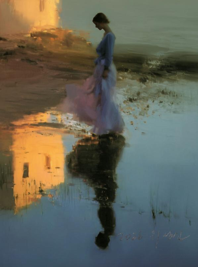 작가의 핵심 철학인 '우아한 생존'의 정점을 보여주는 사색의 기록이다. 흔들림 없는 수면은 어떤 풍파 속에서도 잃지 않는 인간의 평정심을, 그 위에 우아하게 서 있는 여인은 주체적으로 삶의 아름다움을 빚어내는 태도를 의미한다. 배경의 은은한 황금빛은 우리가 잊고 있던 본연의 숭고함에 닿기 위한 통로이자 삶을 재건하는 따뜻한 치유의 에너지다.