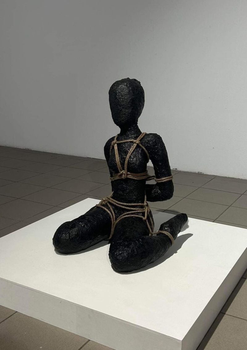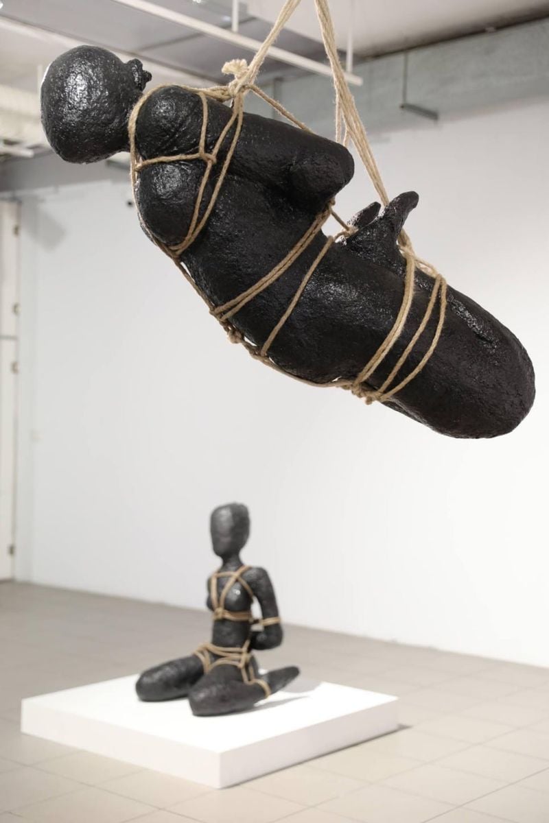 반면 검은 조형물로 구현된 조각 작업은 또 다른 긴장감을 형성한다. 세부 묘사가 지워진 익명의 신체는 밧줄에 결박된 채 공중에 매달리거나 낮은 좌대 위에 위태롭게 놓여 있으며, 이는 제도와 관습이라는 보이지 않는 구조 속에 포획된 현대인의 억압과 불안을 상징한다.