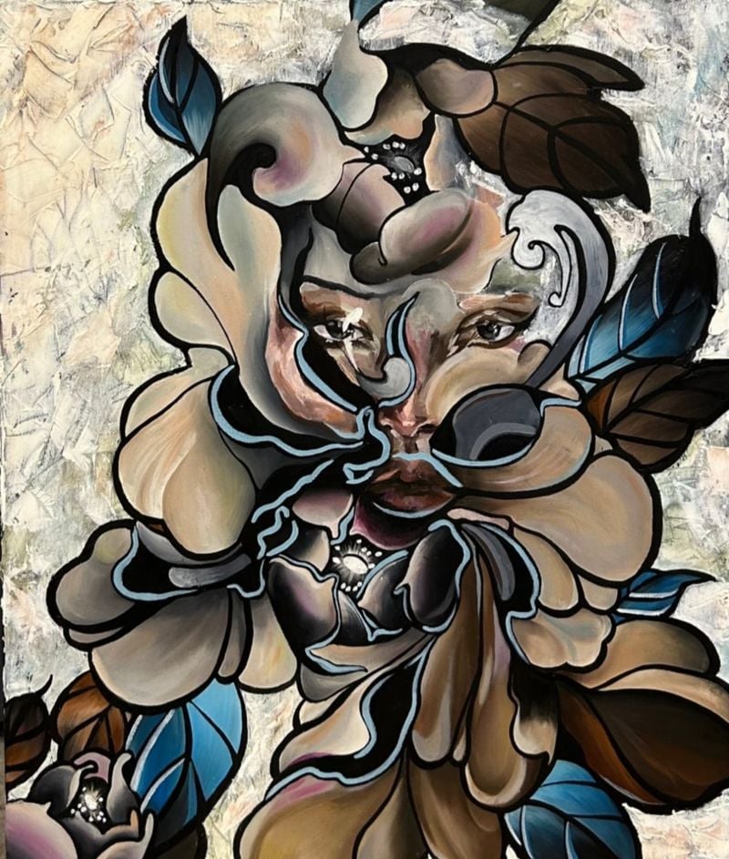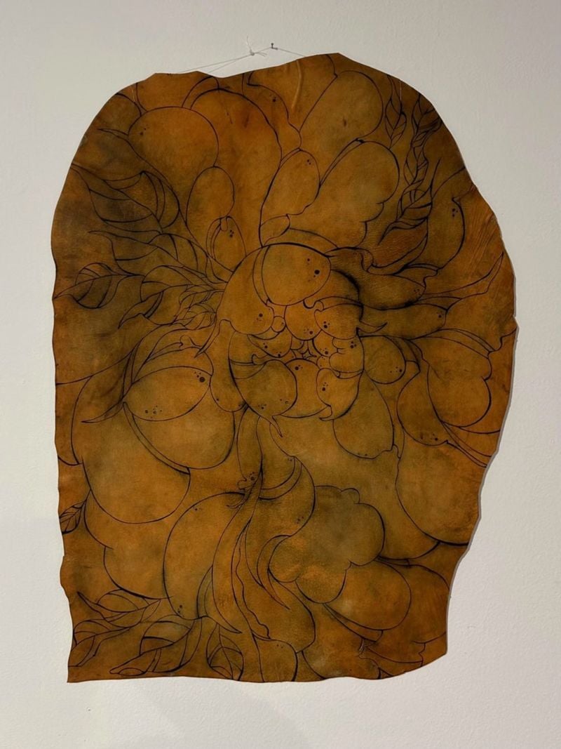 이번 전시에서 특히 주목되는 연작은 돼지 가죽을 캔버스로 삼아 타투 기법으로 완성한 작업들이다. 돼지 가죽이 생물학적으로 인간의 피부와 가장 유사한 조직을 지닌 재료라는 점에 주목하며, 작가가 이미 생명을 다한 표면 위에 바늘과 잉크로 새로운 서사를 새겨 넣는 방식을 통해 피부의 연약함과 흔적의 영속성을 동시에 환기한다고 한다. 꽃과 꽃잎이 겹겹이 중첩된 화면과 불규칙한 검은 점들은 감정의 흔적을 시각적 기록으로 정착시키며, 신체를 감각과 기억의 표면으로 읽어내는 작가의 시선을 선명하게 보여준다.