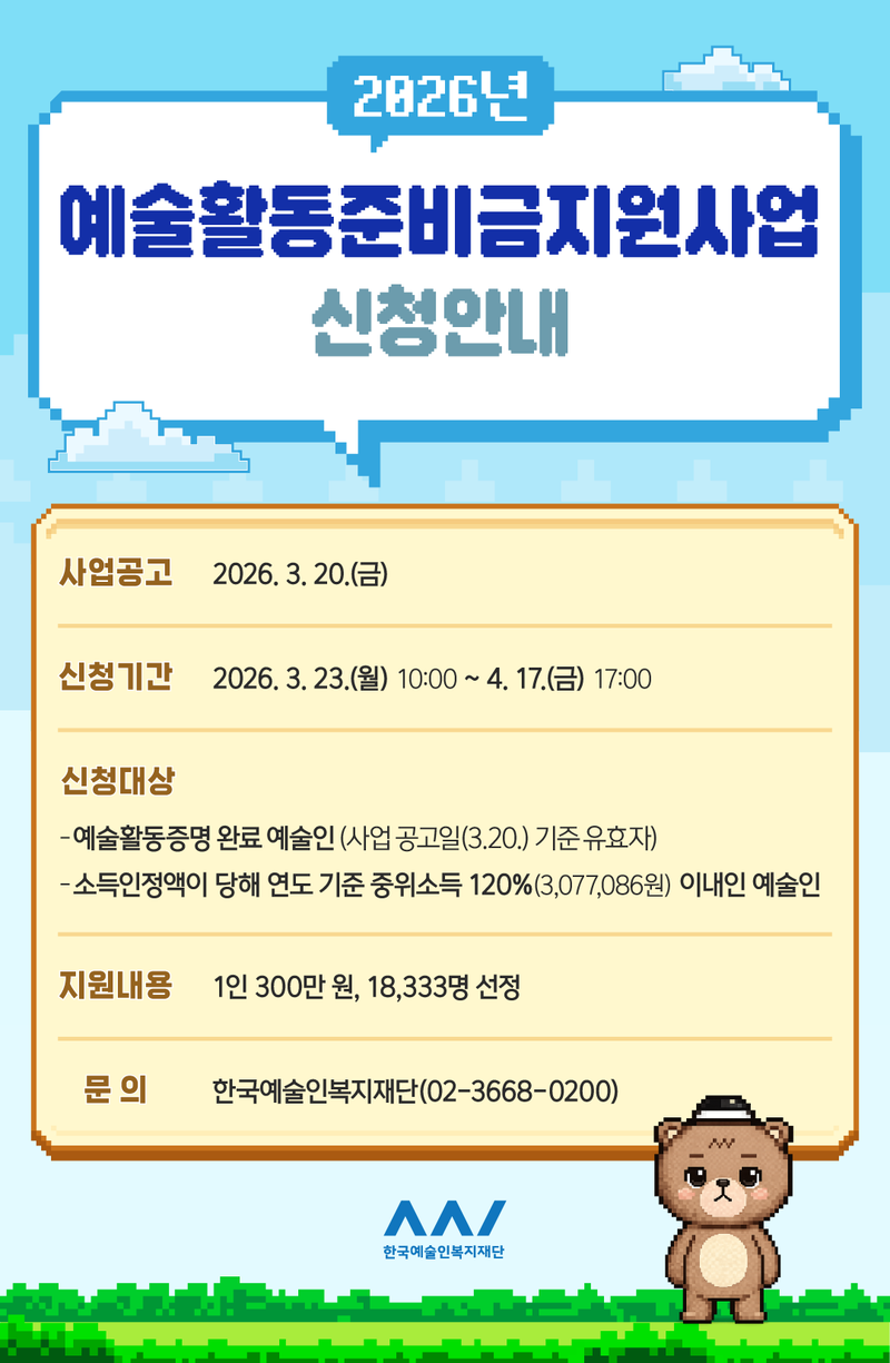 문화체육관광부와 한국예술인복지재단이 오는 3월 23일부터 4월 17일까지 ‘2026년 예술활동준비금’ 신청을 받는다. 이번 사업은 예술 외적인 어려움으로 창작 활동을 이어가기 힘든 예술인들에게 인당 300만 원을 지원해 예술 활동을 지속할 수 있도록 돕는 제도다. 올해는 총 1만 8천여 명이 혜택을 받을 예정이다.