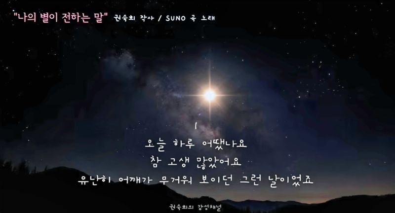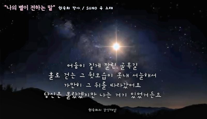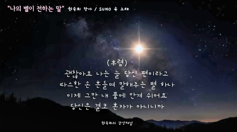 [문화예술=코리아아트뉴스 이청강 기자] 권숙희 시인이 AI로 작곡한 <나의 별이 전하는 말> 곡은 밤하늘의 별을 매개로 외로운 이들에게 위로와 동행의 메시지를 전한다.