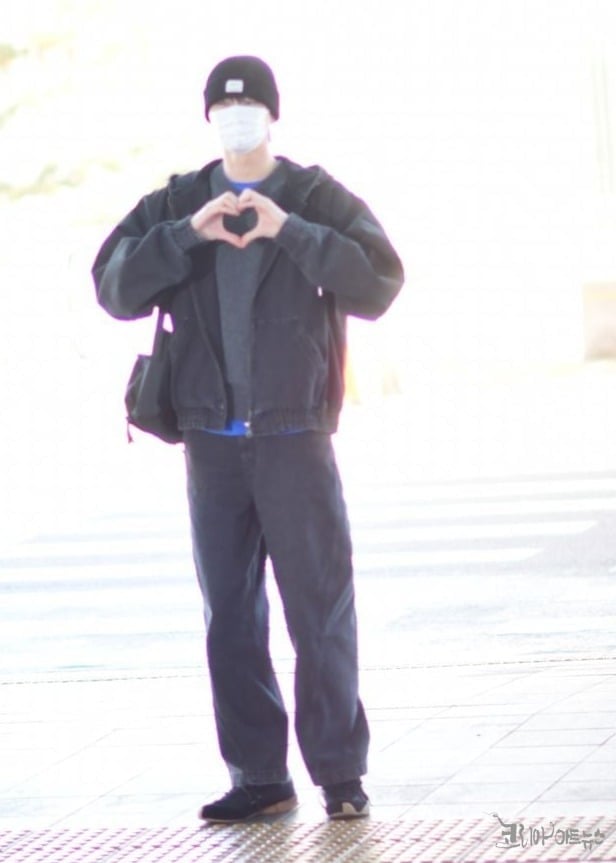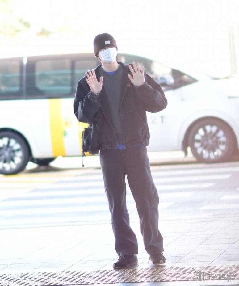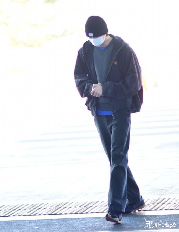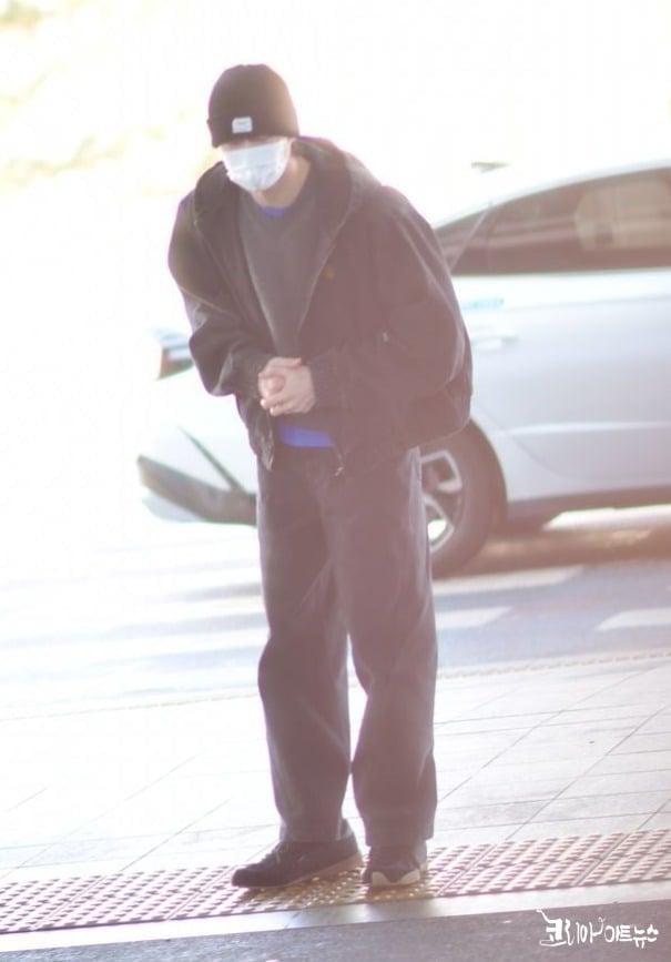 그는 마스크로 얼굴을 가린 채 공항에 등장했으며, 트렌디한 비니 패션으로 시선을 끌었다.