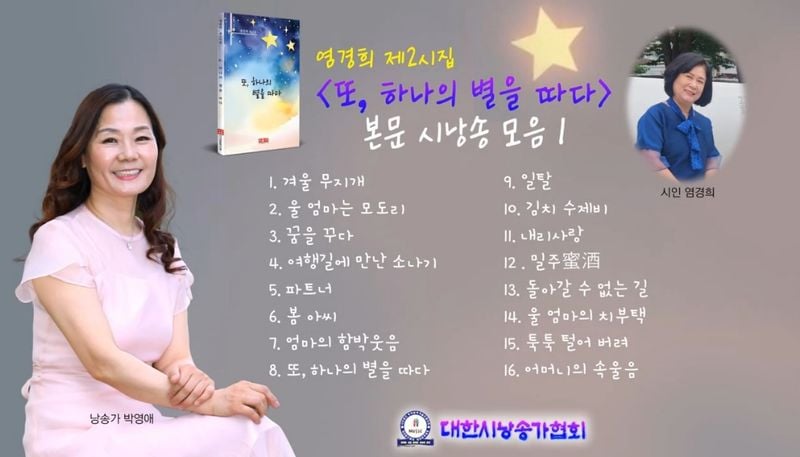 염경희 작가는 제1시집 <별을 따다>와 수필집 <청춘아! 쉬어가렴> 등을 발간한 바 있으며, 오는 26일에 제2시집 <또, 하나의 별을 따다> 출간을 앞두고 있다.