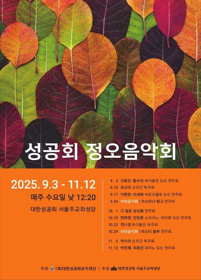 [음악=코리아아트뉴스 이청강 기자] 2025 하반기 성공회 정오음악회가 지난 9월 3일부터 오는 11월 12일까지, 매주 수요일 낮 12시 20분에 클래식 음악으로 관객들과 소통한다.
