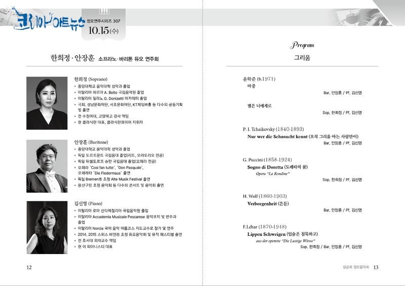 오는 10월 15일 수요일에는 소프라노 한희정, 바리톤 안장훈이 출연해 성악 듀오 연주회가 개최될 예정이다.