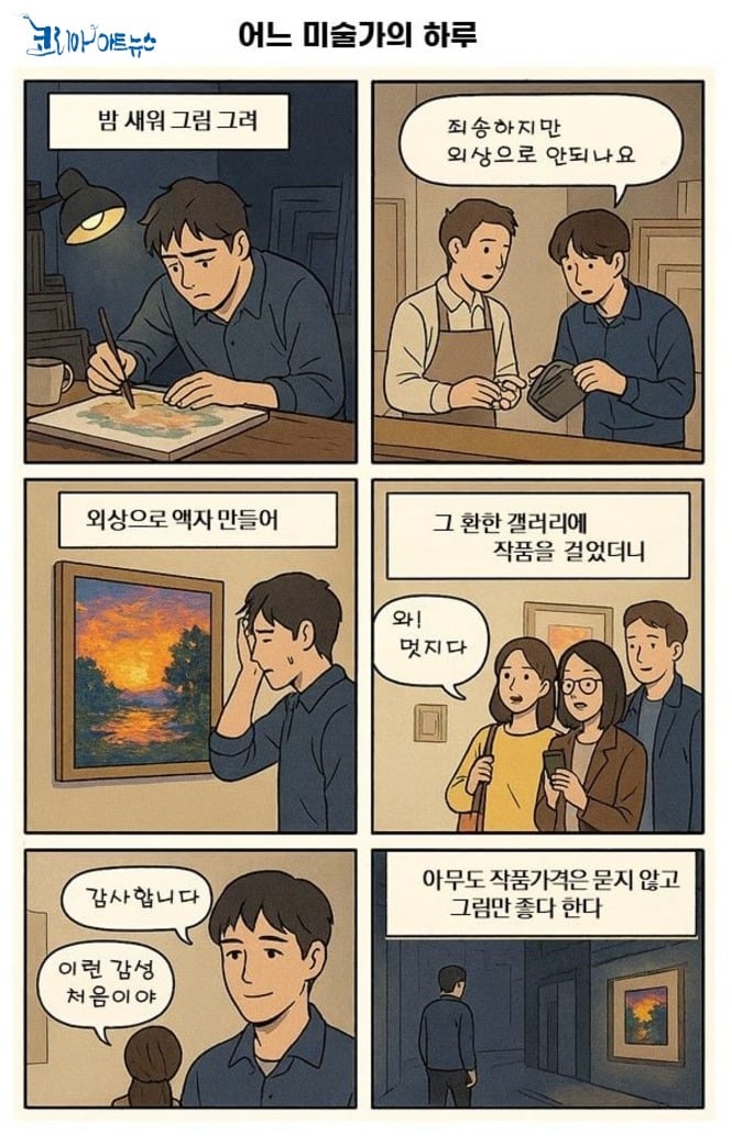 “아무도 / 작품 가격은 묻지 않고 / 그림만 좋다 한다” — 이 대목은 예술가만이 겪는 씁쓸한 현실을 정면으로 마주하게 한다. 관람객들은 그림을 보고 감탄하지만, 그 감탄은 작품의 생계적 가치에는 닿지 않는다. 감상은 넘치지만, 구매는 없다. 예술가의 삶은 감동을 주지만, 그 감동은 예술가의 생존을 보장하지 않는다.